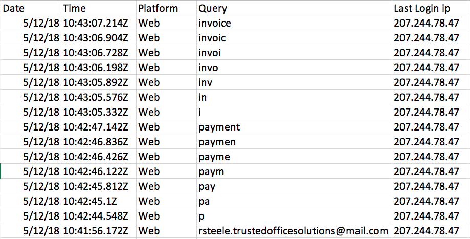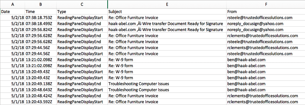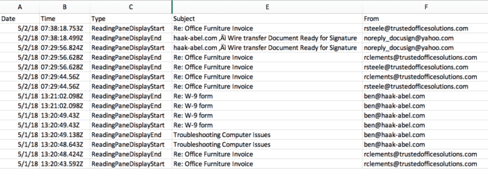 You can view the results below to see the tool’s capabilities, run against a test Office 365 account that was created for LMG’s upcoming Data Breaches course at Black Hat. The search activity report shows a threat actor searching for terms like “invoice” and “payment.”