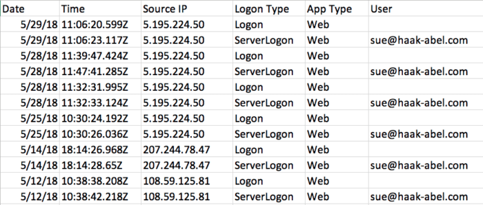 In the logon activity report, several different IP addresses are seen logging in to the account.